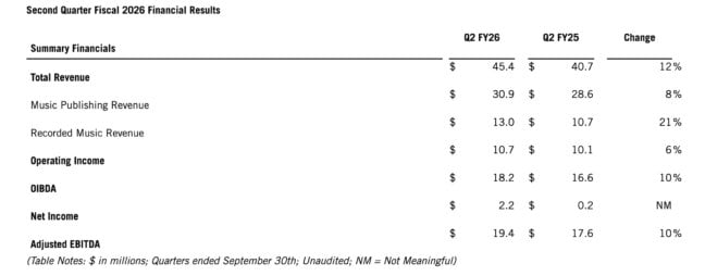 Reservoir Media delivered strong fiscal Q2 2026 results, covering calendar Q3 2025. The New York-based company earned $45.4 million in revenue, a 12% year-over-year increase. Organic growth reached 7% when excluding acquisitions.